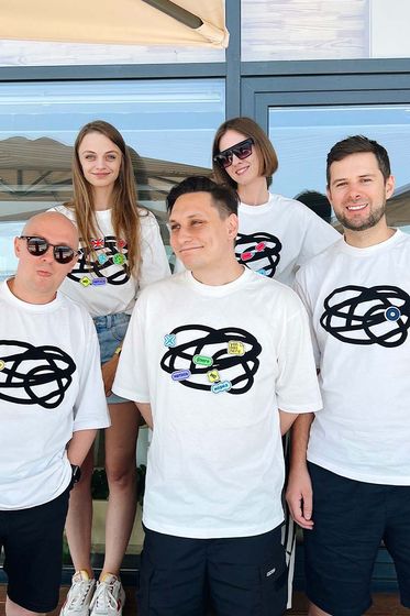 Футболки с 3Д сменными наклейками, которые делают корпоративный мерч «про каждого». Всем раздают свои наборы: имя, ачивка, шутка. Команда